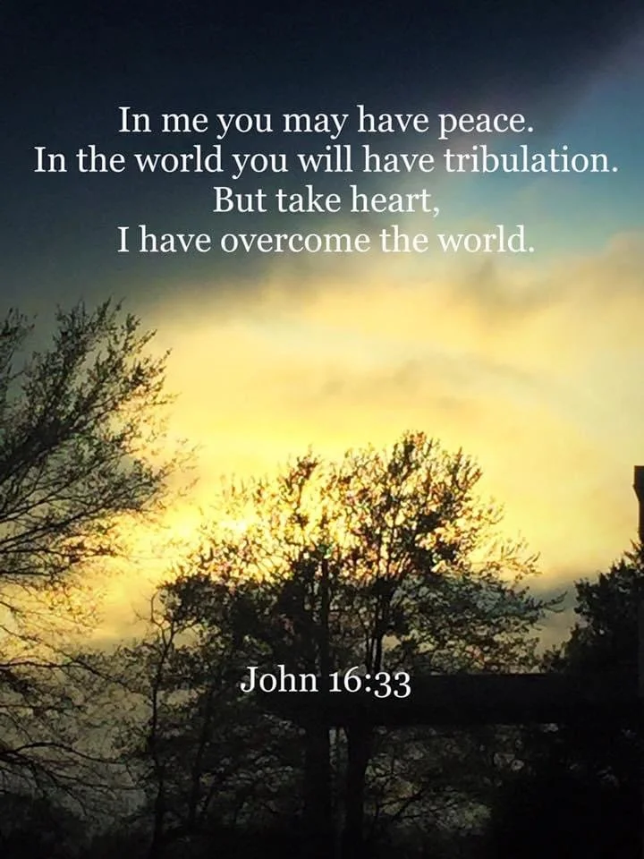 “In me you may have peace. In the world you will have tribulation. But take heart, I have overcome the world.”